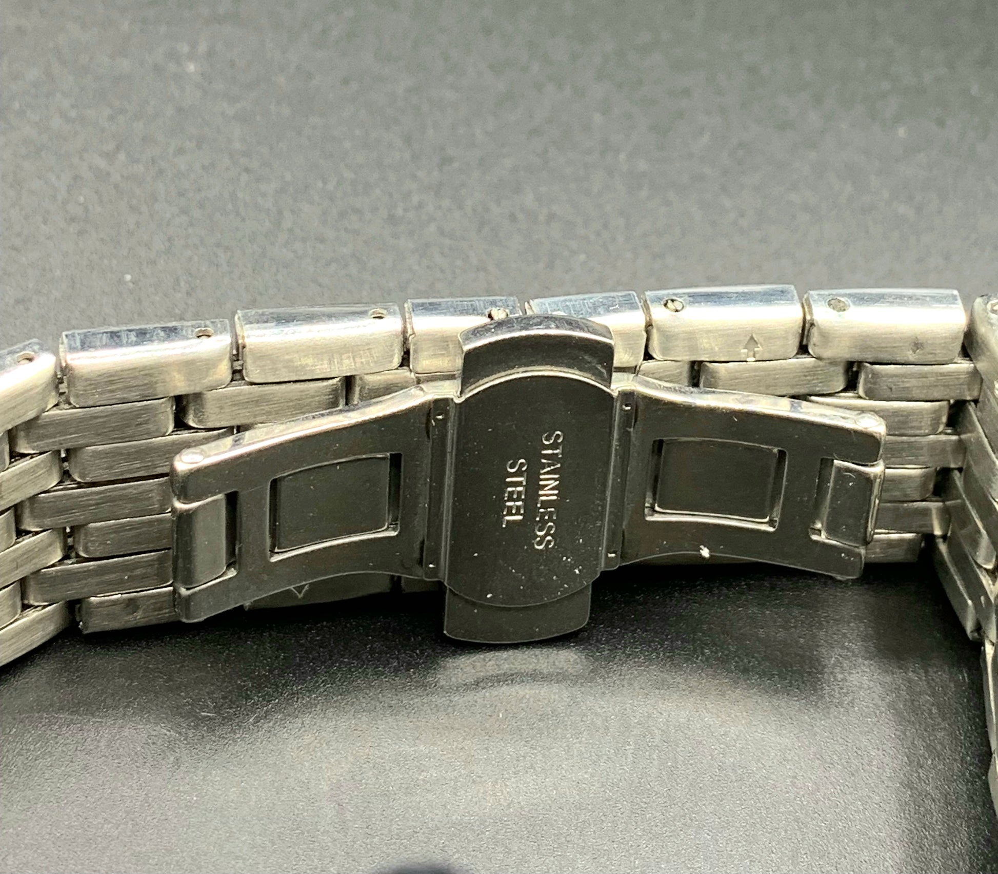 Bracelet: A comfortable and secure stainless steel multi-link bracelet with a fold-over clasp clearly stamped "STAINLESS STEEL" on the inside.
